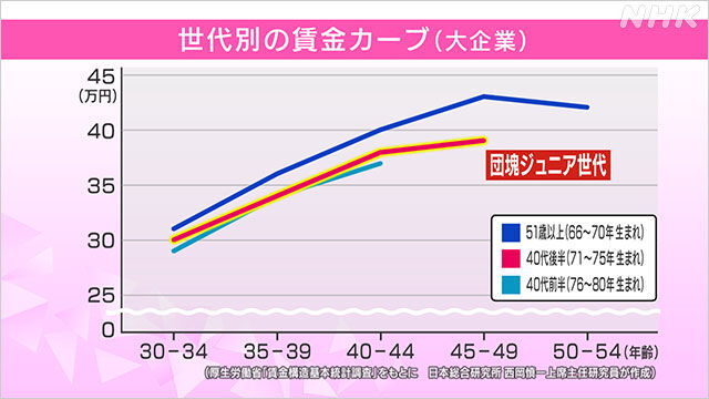 このグラフは、ボーナスや時間外労働を除いた基本給にあたる「所定内給与」の推移を表していますが、20代~30代の若い世代はベースが昇給している一方で、40代~50代は以前より低い水準になっていました。