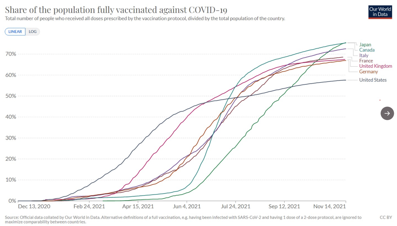 日本は初期の混乱を乗り越えただけでなく、地球上のほとんどの国より高い接種率を達成した。現在は日本人の約76%が接種を完了している。