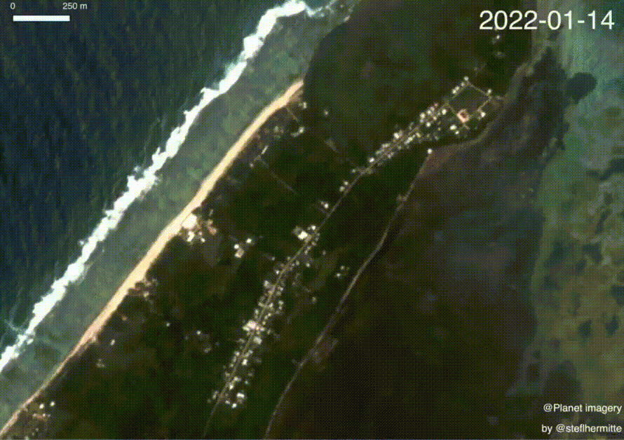 (トンガ本島北部 🇹🇴 の@planet 🛰 データの更新プロットでは、すべての集落が流され、津波の惨状がより詳細に示されています。)
