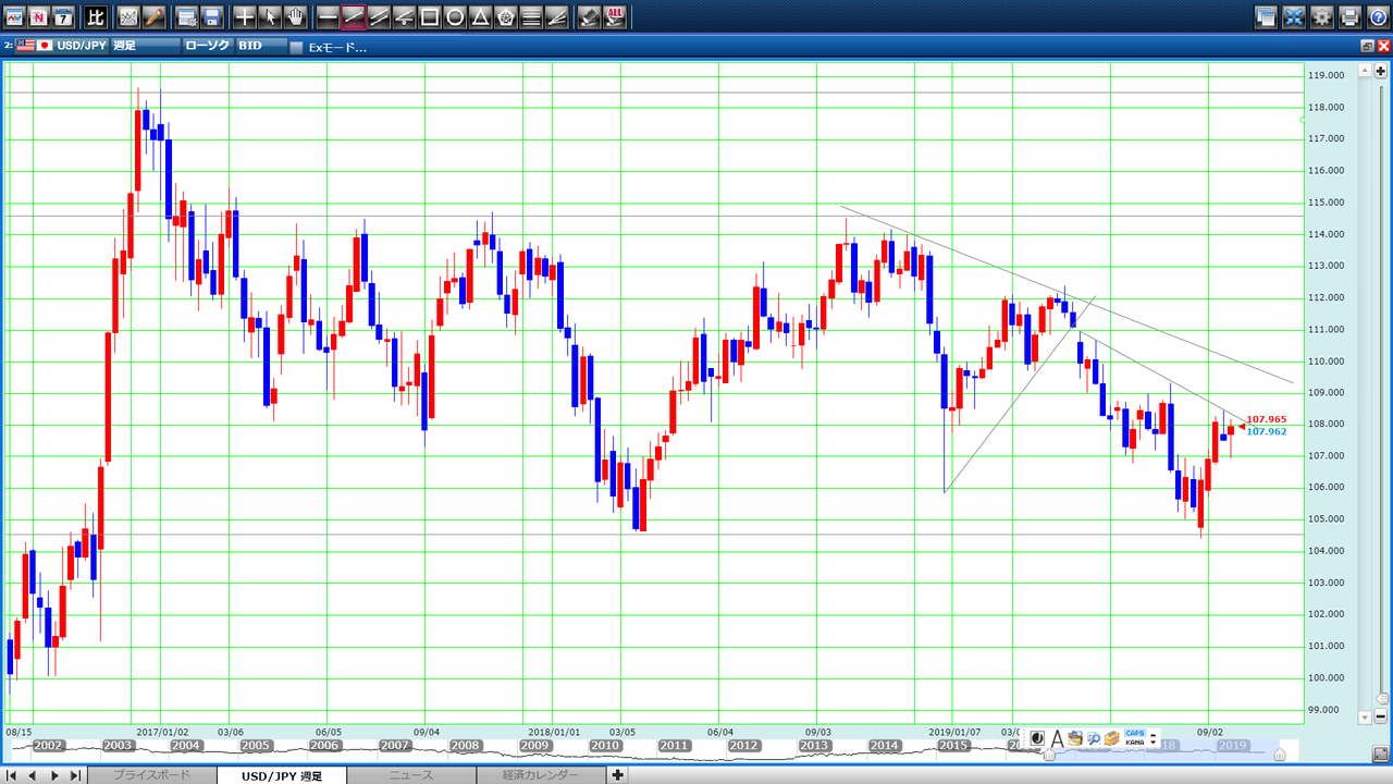 @up_gap本日はドル円週足。水平線はわかりやすく引けた。週足で見ると全然トレードできる感じがしない。まだまだ時間がかかりそう。