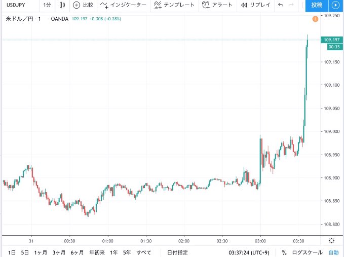 @T_cut07「保険的利下げ」この発言がドル買いシグナルになったようです。(ドル円1分足)