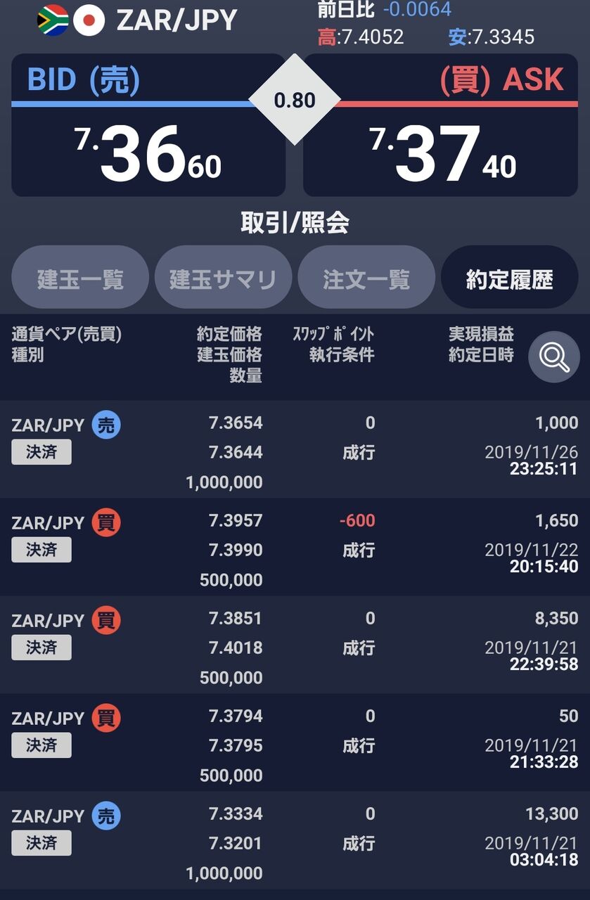 @polarium111/26 ランド円7.367売→7.356買薄利だったけどトレードは今日はこれでおわり後は下がったら少し買う