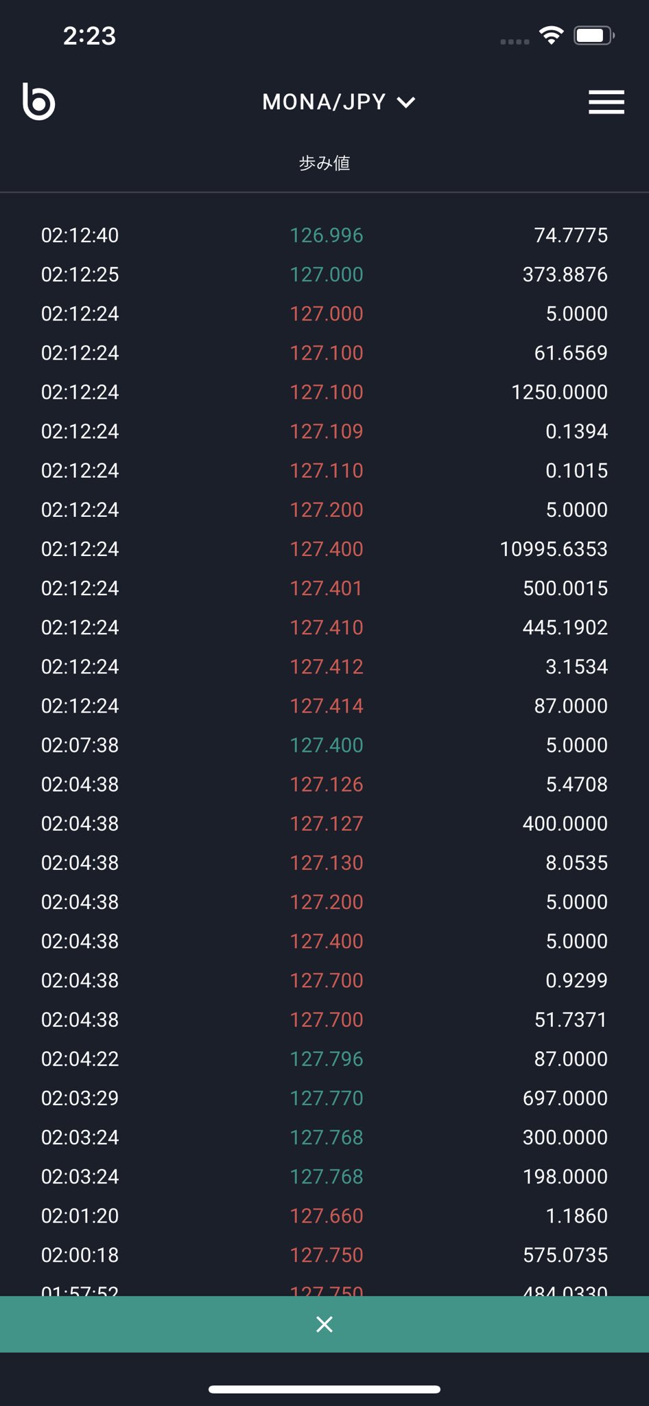 @pirikamさあ、モナコイン、歩み値は動いているようだが前より鈍くなって来た。129円付近の0.0001枚成り売りが続いているぞ。意識を下に向かせているようだ。上がったほうがいいのにボットで0.0001枚売りをしている。おおっとお?ここで、ここで0.0001枚成り買いだあ。