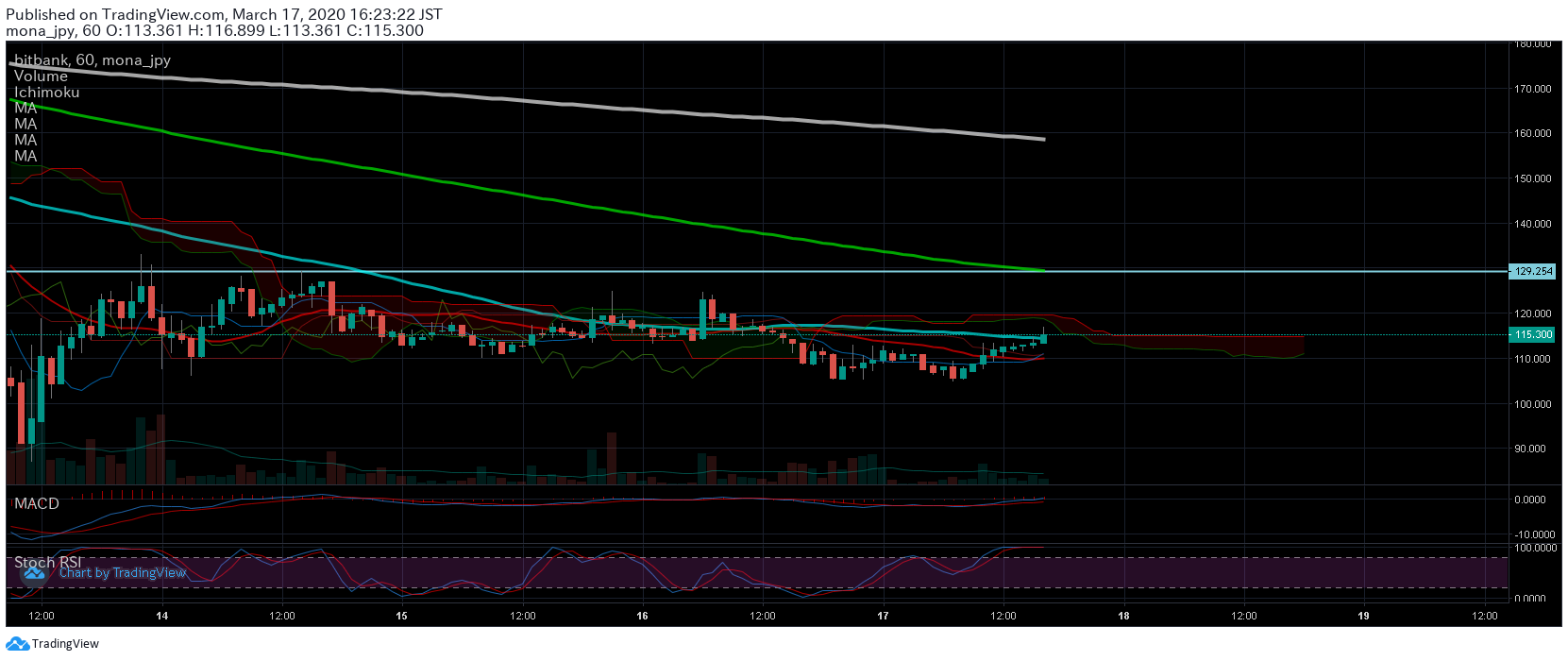 @AV85230415モナコイン1時間足(左)雲抜ければとりあえず129位を目指してくると思われるが日足(右)を観た場合移動平均線がまだまだ下向きなので上昇したら売られるといった値動きが続くと思われる#モナコイン #チャート分析