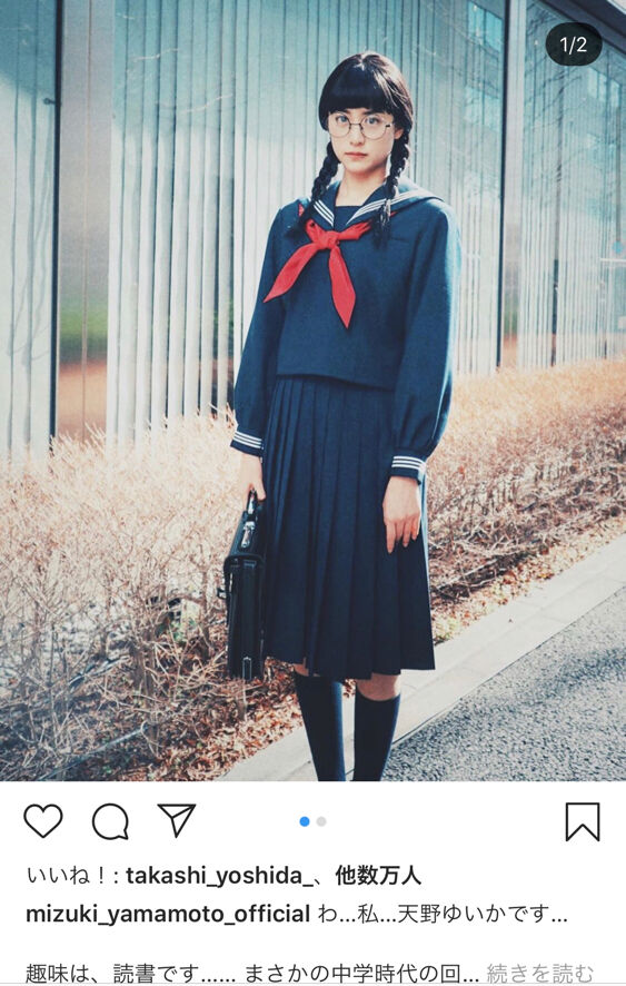 それは山本が三つ編みのお下げ髪で、紺色の古めかしい長袖セーラー服を着ているショット。同日で最終回を迎えた主演ドラマ「ランチ合コン探偵 ~恋とグルメと謎解きと~」(日本テレビ系)の撮影で中学生の頃の回想シーンを撮ることになって、セーラー服を身に着けた時のもののようだ。