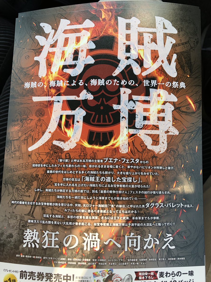 | ONE PIECE > ONE PIECE (アニメ) > ONE PIECE STAMPEDE 『ONE PIECE STAMPEDE』(ワンピース スタンピード)は、2019年8月9日に公開予定の日本のアニメーション映画。漫画『ONE PIECE』を原作としたテレビアニメの劇場版第14作。 22キロバイト (2,399 語) - 2019年6月14日 (金) 13:24 |
