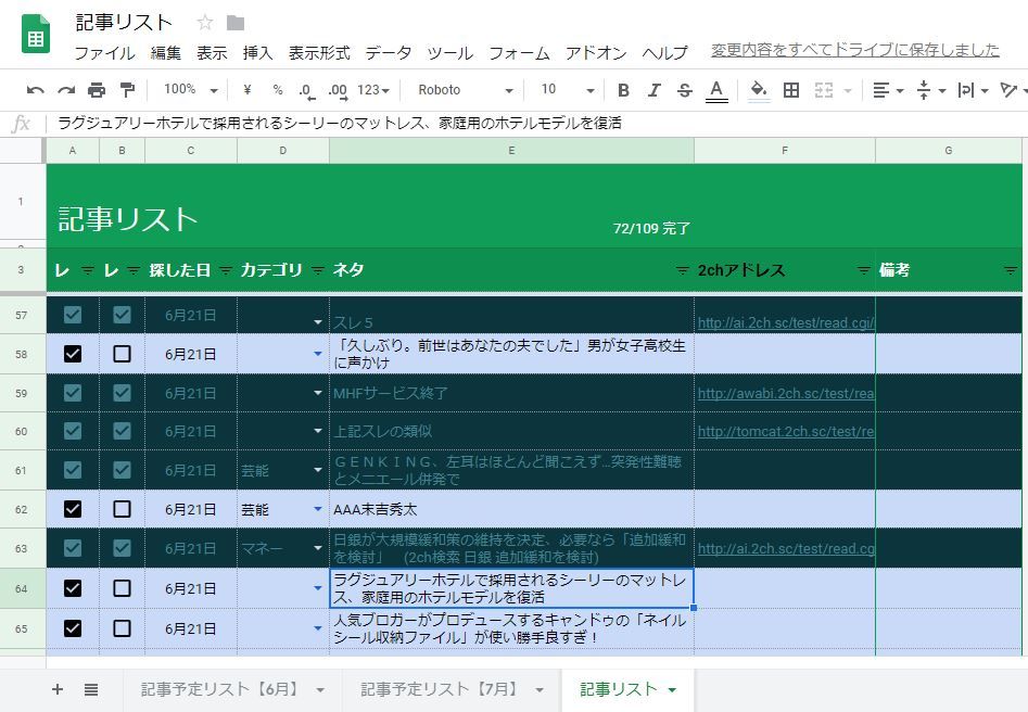 記事アップ予定と記事アップ確定で色分けチェックボックス付き