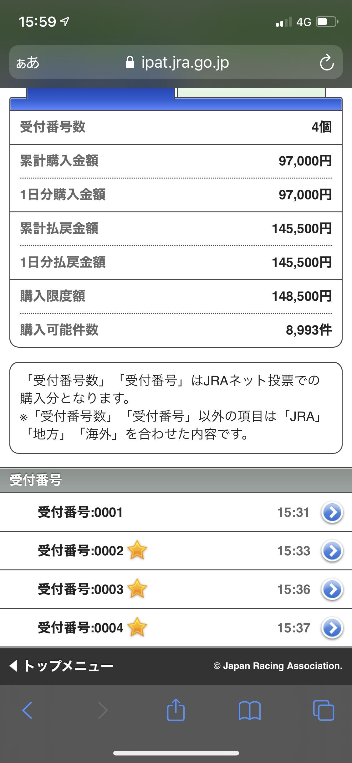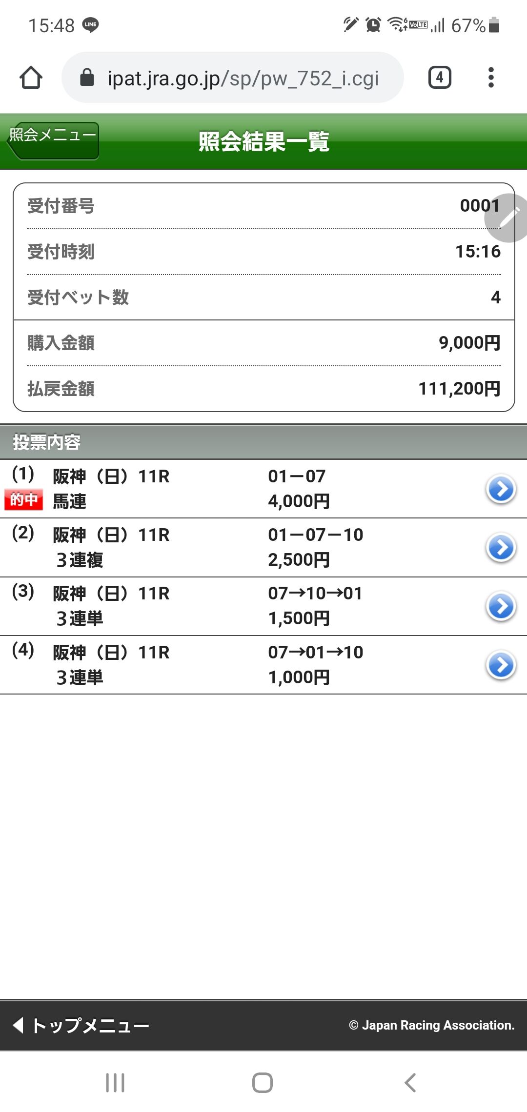 単勝、馬連、3連複当たったけどもっとユニコーンライオン馬連厚めに買っとけば良かった